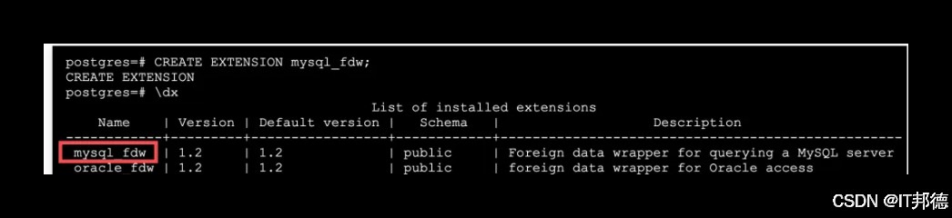 1)加载扩展插件 CREATE EXTENSION mysql_fdw; 2)创建服务器对象 CREATE SERVER mysql_server FOREIGN DATA WRAPPER mysql_fdw OPTIONS (host '192.168.3.11', port '3306'); 3) 授权 GRANT USAGE ON FOREIGN SERVER mysql_server TO postgres;
