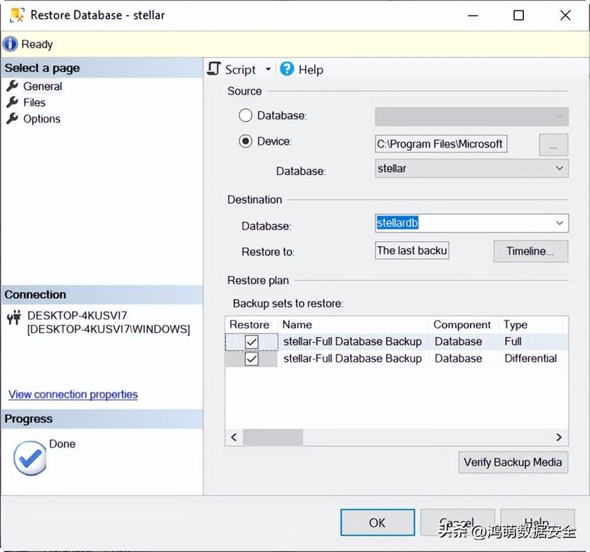 USE [master] RESTORE DATABASE [stellardb] FROM DISK = N'C:\MSSQL\Backup\stellar.bak' WITH FILE = 1, MOVE N'AdventureWorks2017' TO N'C:\data\stellardb.mdf', MOVE N'AdventureWorks2017_log' TO N'C:\data\stellardb_log.ldf', NORECOVERY, NOUNLOAD, STATS = 5 RESTORE DATABASE [stellardb] FROM DISK = N'C:\MSSQL\Backup\stellar.bak' WITH FILE = 2, NOUNLOAD, STATS = 5 GO