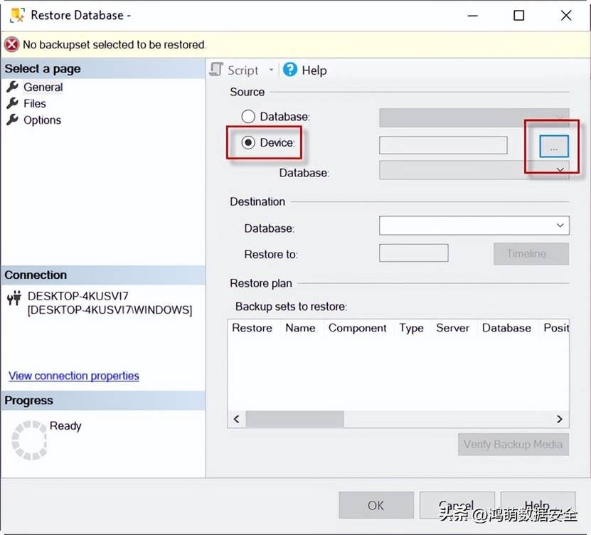 3.接下来将显示"还原数据库"窗口。在"常规"页面的"源"部分下,选择以下任一选项: