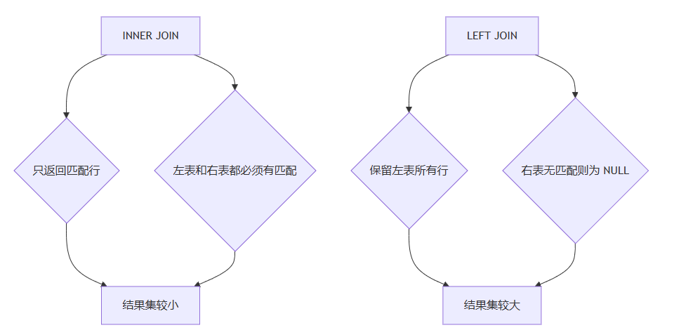 INNER JOIN 与 LEFT JOIN 的区别在于,LEFT JOIN 会保留左表中没有匹配项的行(用 NULL 填充右表字段),而 INNER JOIN 会完全忽略这些行。