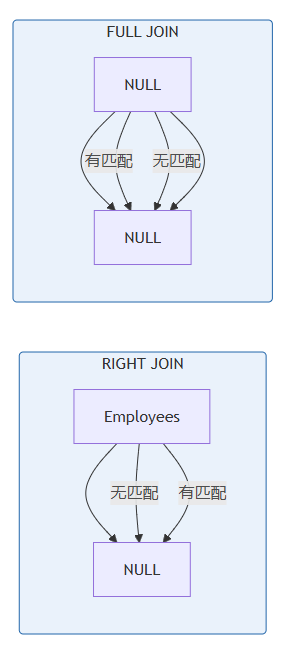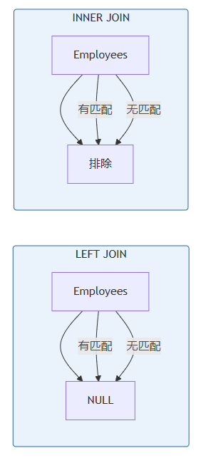 - 查找缺失数据: 可以轻松识别哪些记录在关联表中找不到匹配项(例如,哪些员工没有分配部门)。