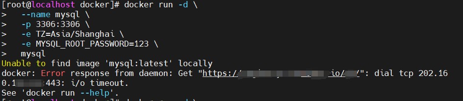 //重启: sudo systemctl daemon-reload sudo systemctl restart docker //安装mysql: docker run -d \ --name mysql \ -p 3306:3306 \ -e TZ=Asia/Shanghai \ -e MYSQL_ROOT_PASSWORD=123 \ mysql