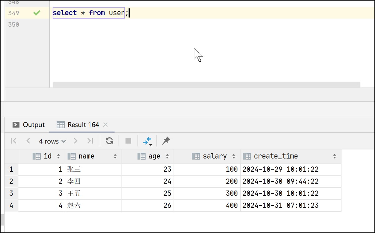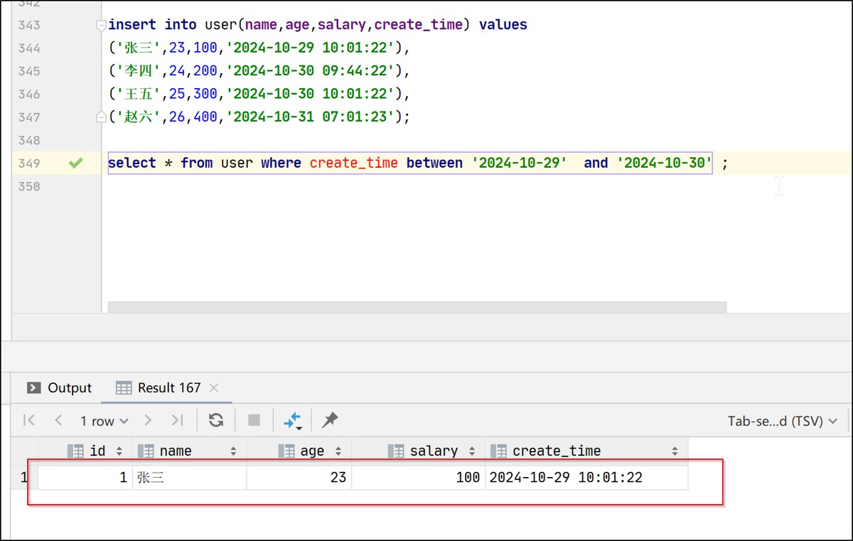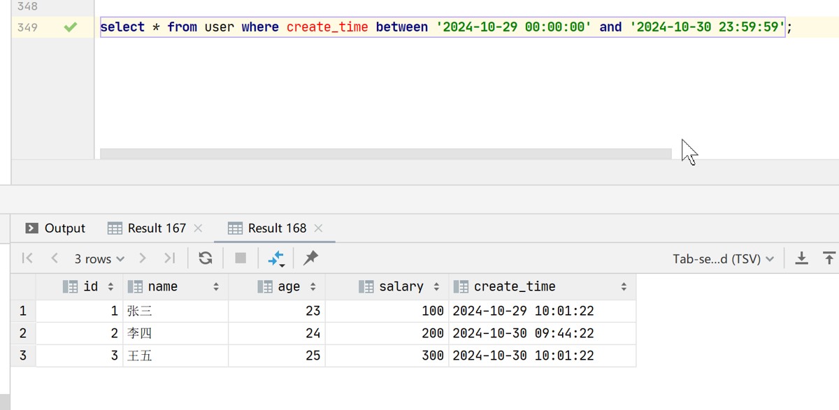 -- 查询用户表中创建时间在2024-10-29到2024-10-30之间的数据 select * from user where create_time between '2024-10-29' and '2024-10-30'; 等同于 select * from user where create_time >= '2024-10-29 00:00:00' and create_time <= '2024-10-30 00:00:00';