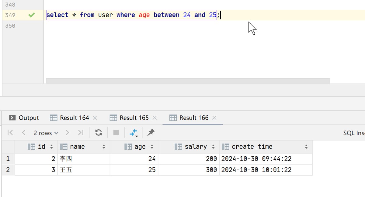 -- 查询用户表中年龄在24到25之间的用户 select * from user where age between 24 and 25; 等同于 select * from user where age >= 24 and age <= 25;