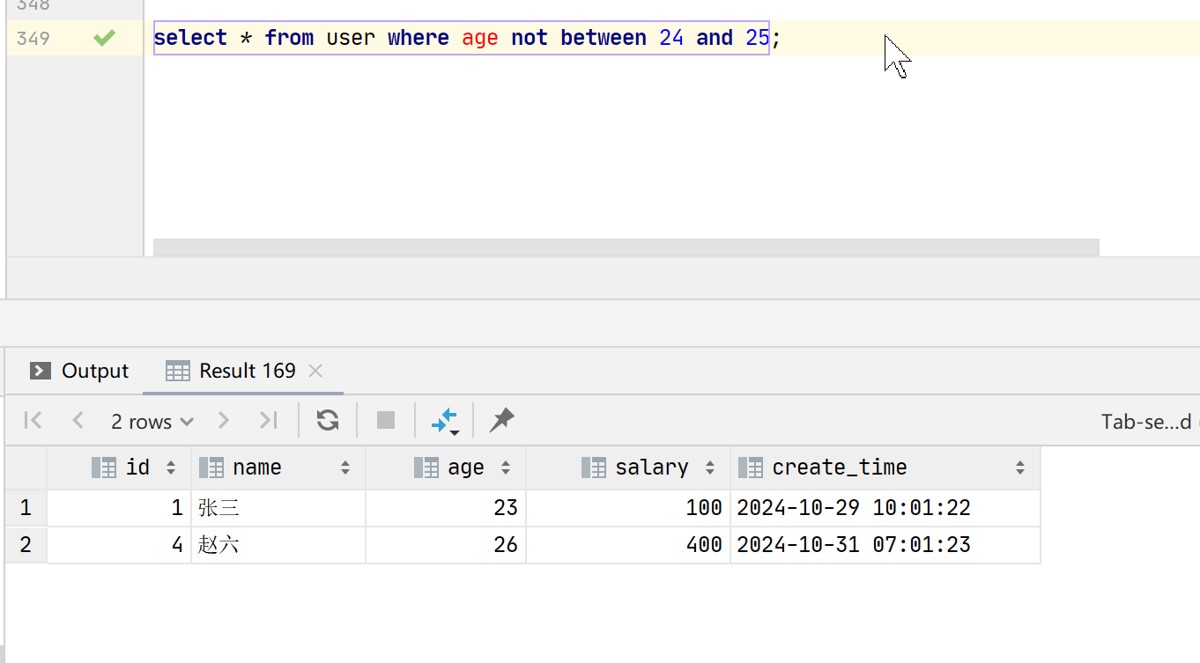 -- 查询用户表中年龄不在24到25之间的用户 select * from user where age not between 24 and 25; 等同于 select * from user where age < 24 or age > 25;