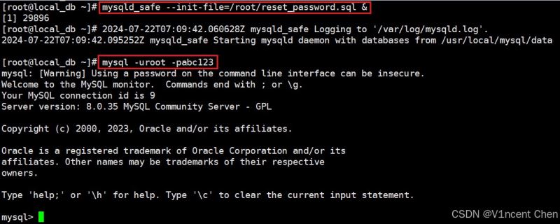 可以看到启动后,root用户的密码已经成功被修改为’abc123’,最后将reset_password.sql文件删除即可。