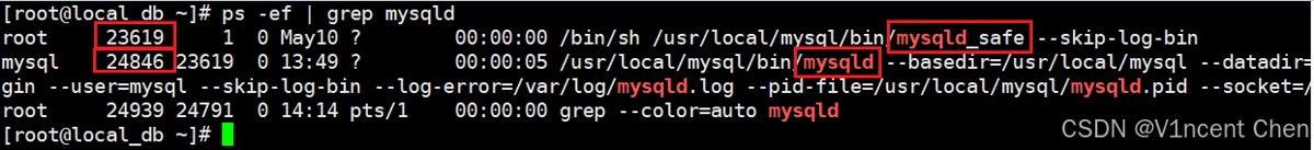 进程号为23619的mysqld_safe守护进程,负责监控mysqld的状态
