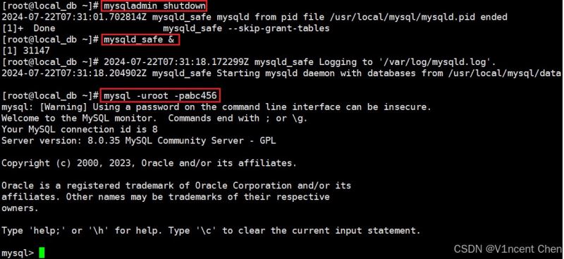 mysqladmin shutdown mysqld_safe & mysql -uroot -pabc456