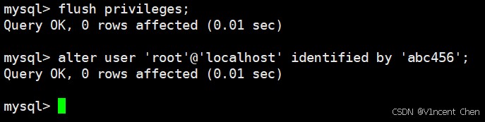 flush privileges; alter user 'root'@'localhost' identified by 'abc456';