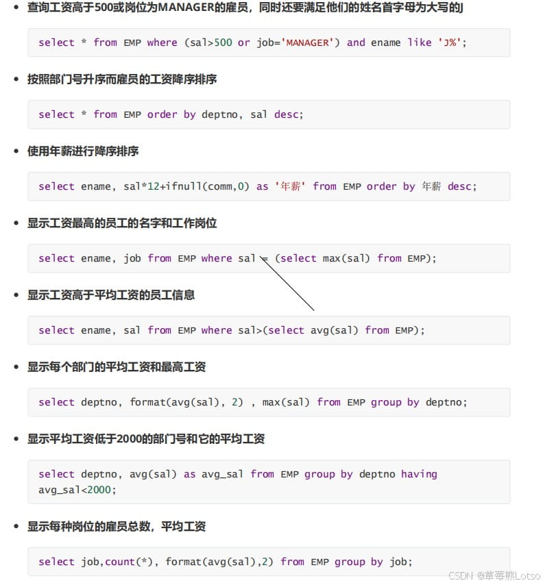 -- 1. 条件筛选:工资>500或岗位为manager,且姓名首字母为J select * from emp where (sal>500 or job='manager') and ename like 'j%'; -- 2. 多字段排序:部门号升序,工资降序 select * from emp order by deptno asc, sal desc; -- 3. 计算字段+排序:年薪(sal*12+补贴)降序 select ename, sal*12+ifnull(comm,0) as 年薪 from emp order by 年薪 desc; -- 4. 聚合查询+筛选:各部门平均工资(保留2位小数)和最高工资 select deptno, format(avg(sal),2) as 平均工资, max(sal) as 最高工资 from emp group by deptno; -- 5. having筛选聚合结果:平均工资低于2000的部门 select deptno, avg(sal) as avg_sal from emp group by deptno having avg_sal < 2000;