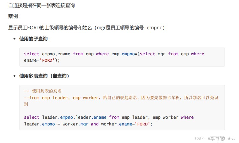 自连接是多表查询的特殊形式 —— 将同一张表当作两张表使用,通过别名区分,适用于查询表内关联数据(如员工与上级领导的关系)。