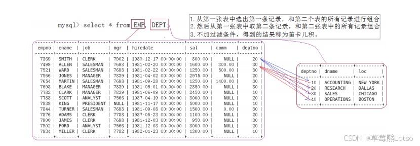 deptno),需用表名.字段区分; - 关联字段类型必须一致:emp.deptno 和 dept.deptno 需同为 int 类型,否则关联失效。