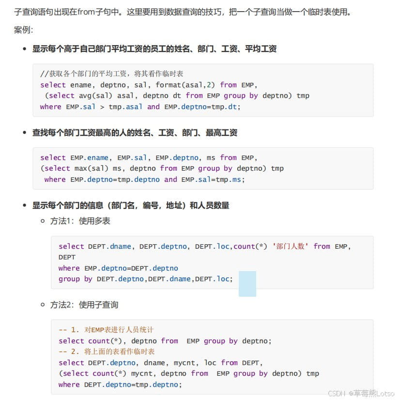 - 多表查询:通过关联字段消除笛卡尔积,适用于跨表提取数据;