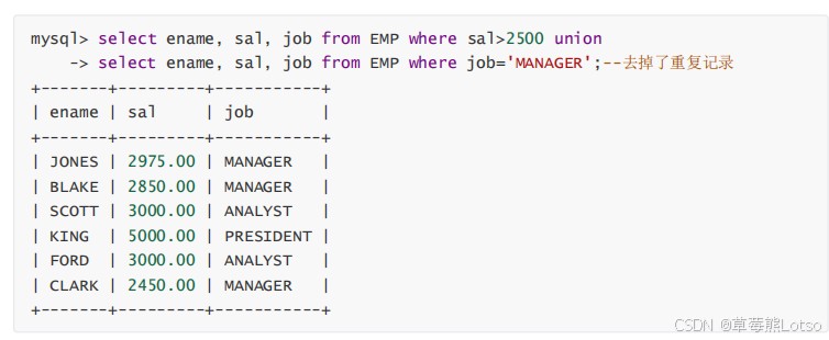 select ename, sal, job from emp where sal>2500 union all -- 保留重复行(manager中工资>2500的员可能会显示多次) select ename, sal, job from emp where job='manager';