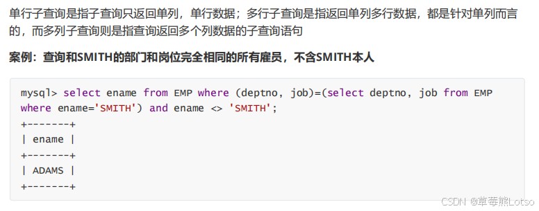 - 单行子查询只能用单行运算符:若子查询返回多行,不能用