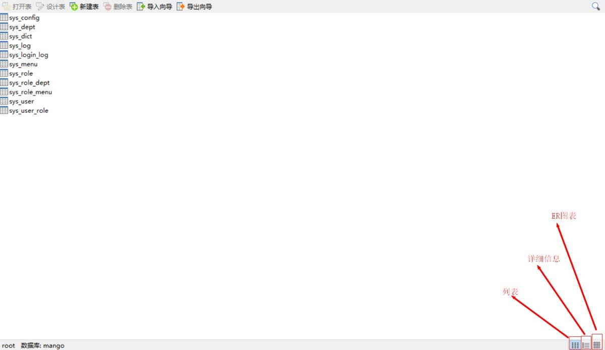 可以看到右下角,有三个查看选项,分别是列表、详细信息、ER图表