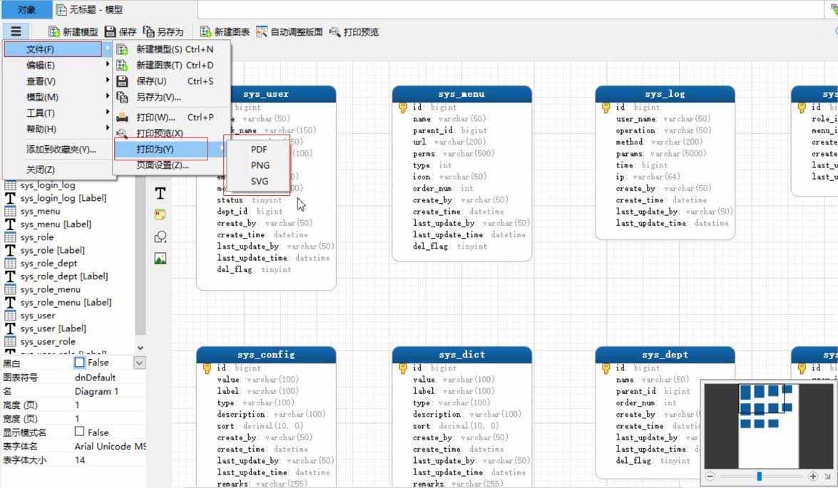 - 这里选择PDF,打印的ER图: