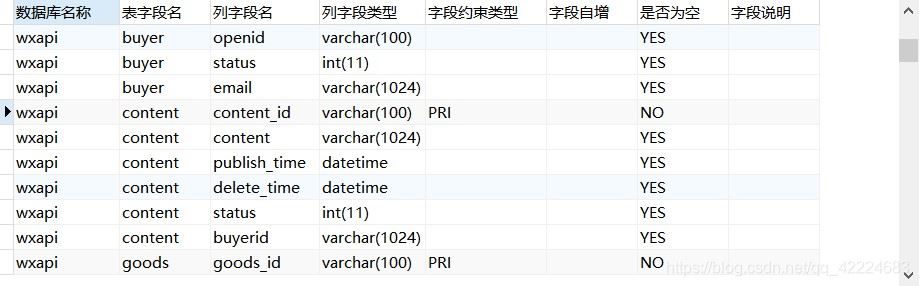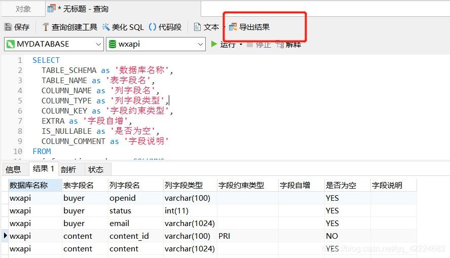 SELECT TABLE_SCHEMA as '数据库名称', TABLE_NAME as '表字段名', COLUMN_NAME as '列字段名', COLUMN_TYPE as '列字段类型', COLUMN_KEY as '字段约束类型', EXTRA as '字段自增', IS_NULLABLE as '是否为空', COLUMN_COMMENT as '字段说明' FROM information_schema. COLUMNS WHERE TABLE_SCHEMA = '数据库名字'