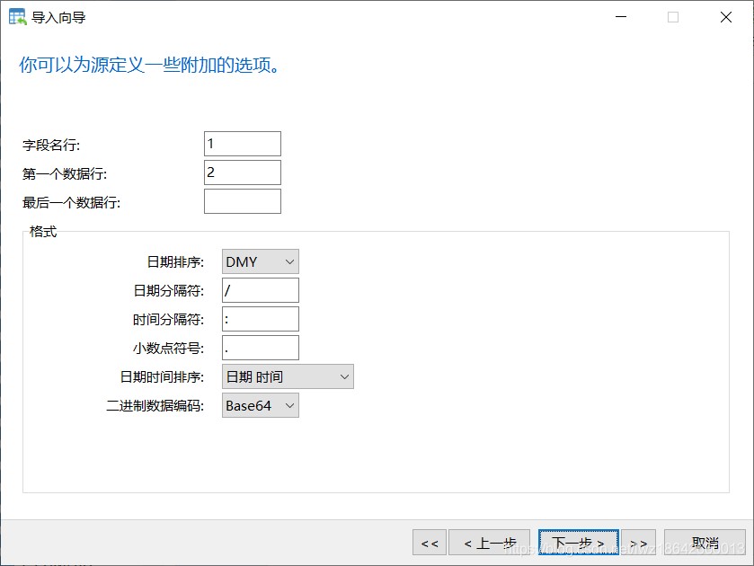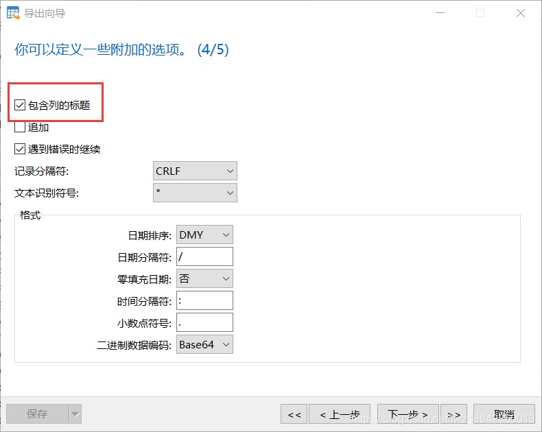 4.定义附加选项,一定要勾选包含列的标题,否则导入时无法对应字段