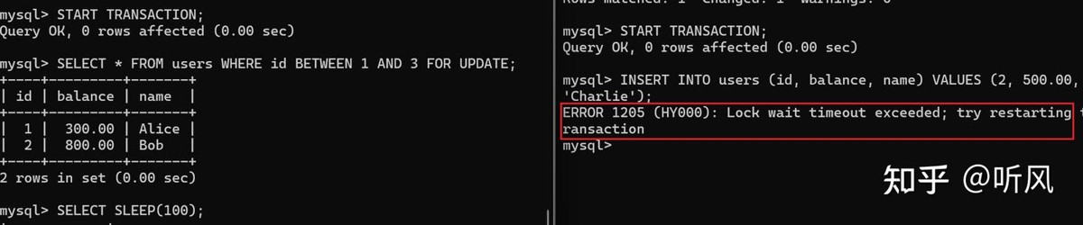 -- 事务A -- 开始事务 START TRANSACTION; -- 执行范围查询(触发间隙锁) SELECT * FROM users WHERE id BETWEEN 1 AND 3 FOR UPDATE; -- 模拟长事务:等待60秒(不提交事务) SELECT SLEEP(60); -- 事务B -- 开始事务 START TRANSACTION; -- 尝试插入间隙内的数据(等待事务A释放间隙锁) INSERT INTO users (id, balance, name) VALUES (2, 500.00, 'Charlie');