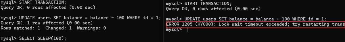 -- 事务A -- 开始事务 START TRANSACTION; -- 更新用户1的余额(获取行锁) UPDATE users SET balance = balance - 100 WHERE id = 1; -- 模拟长事务:等待60秒(不提交事务) SELECT SLEEP(60); -- 事务B -- 开始事务 START TRANSACTION; -- 尝试更新用户1的余额(等待事务A释放锁) UPDATE users SET balance = balance + 100 WHERE id = 1;