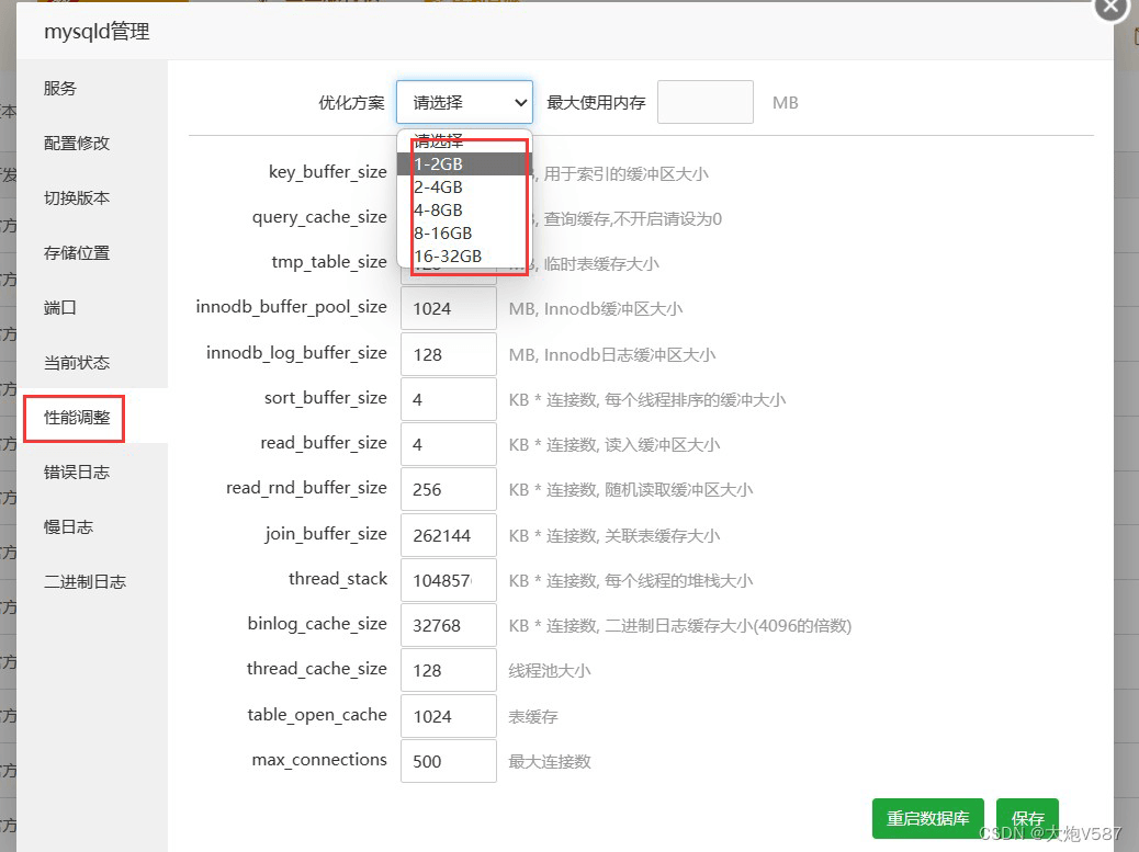 登录到面板—软件商店—mysql管理界面—性能调整,选择与自己的服务器实际内存相匹配的内存大小,然后重启服务器