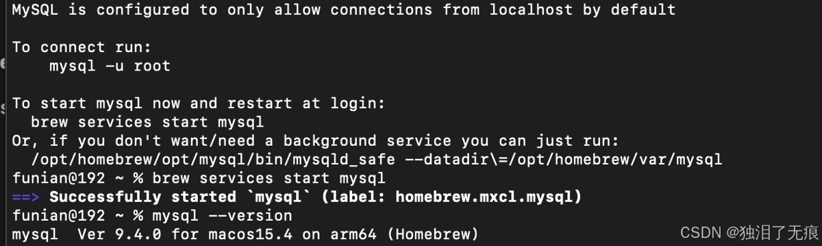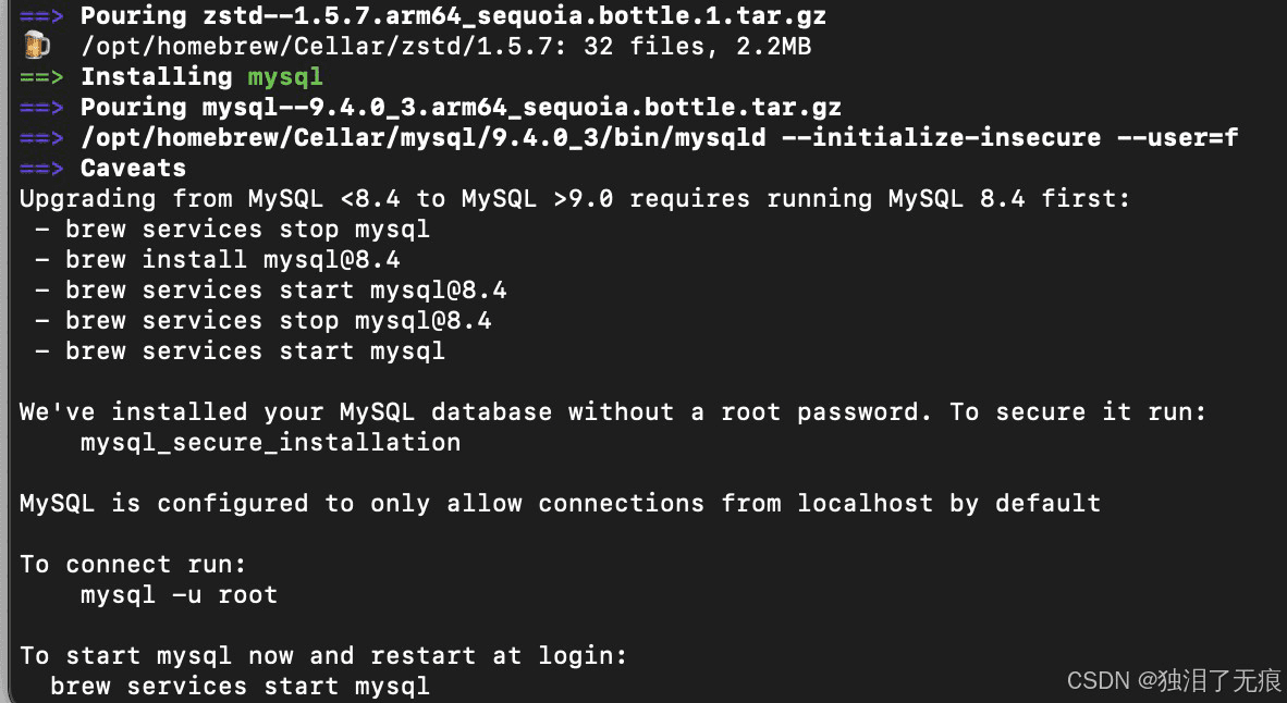 这个命令会触发 Homebrew 的安装流程,包括下载软件包、解析依赖关系、编译安装等步骤。安装过程可能需要一些时间,具体取决于网络速度和系统性能。在安装完成后,Homebrew 会输出一些重要的提示信息,包括 MySQL 的初始配置和安全建议,如下图所示。