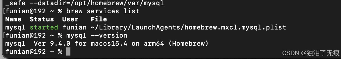 若终端无输出,说明未安装 MySQL,可继续下一步。若输出 mysql 或 mysql@xx,说明已安装,需先卸载(执行 brew uninstall mysql),避免冲突。