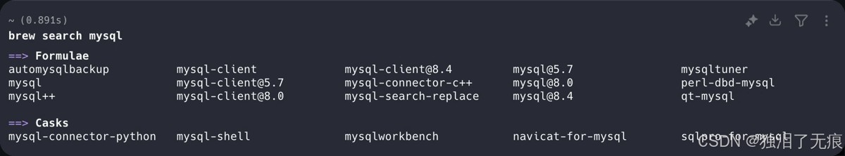 在安装 MySQL 之前,建议先搜索可用的版本。通过执行以下命令可以查看 Homebrew 仓库提供的 MySQL 相关软件包: