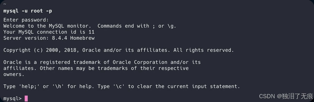 如果一切正常,将看到MySQL的欢迎信息和命令提示符,表明已成功连接到MySQL服务器。