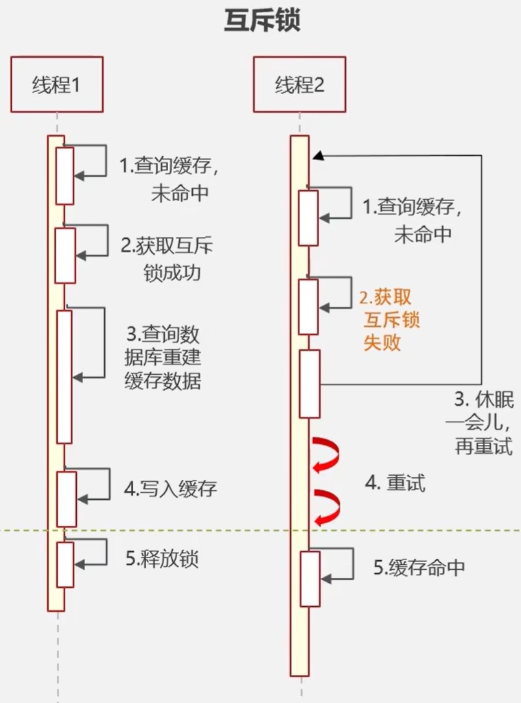 - 未命中:让一个请求获取到锁去查询数据库重建缓存数据,其余未命中且未获取到锁的请求则休眠一段时间后,再次查询缓存。