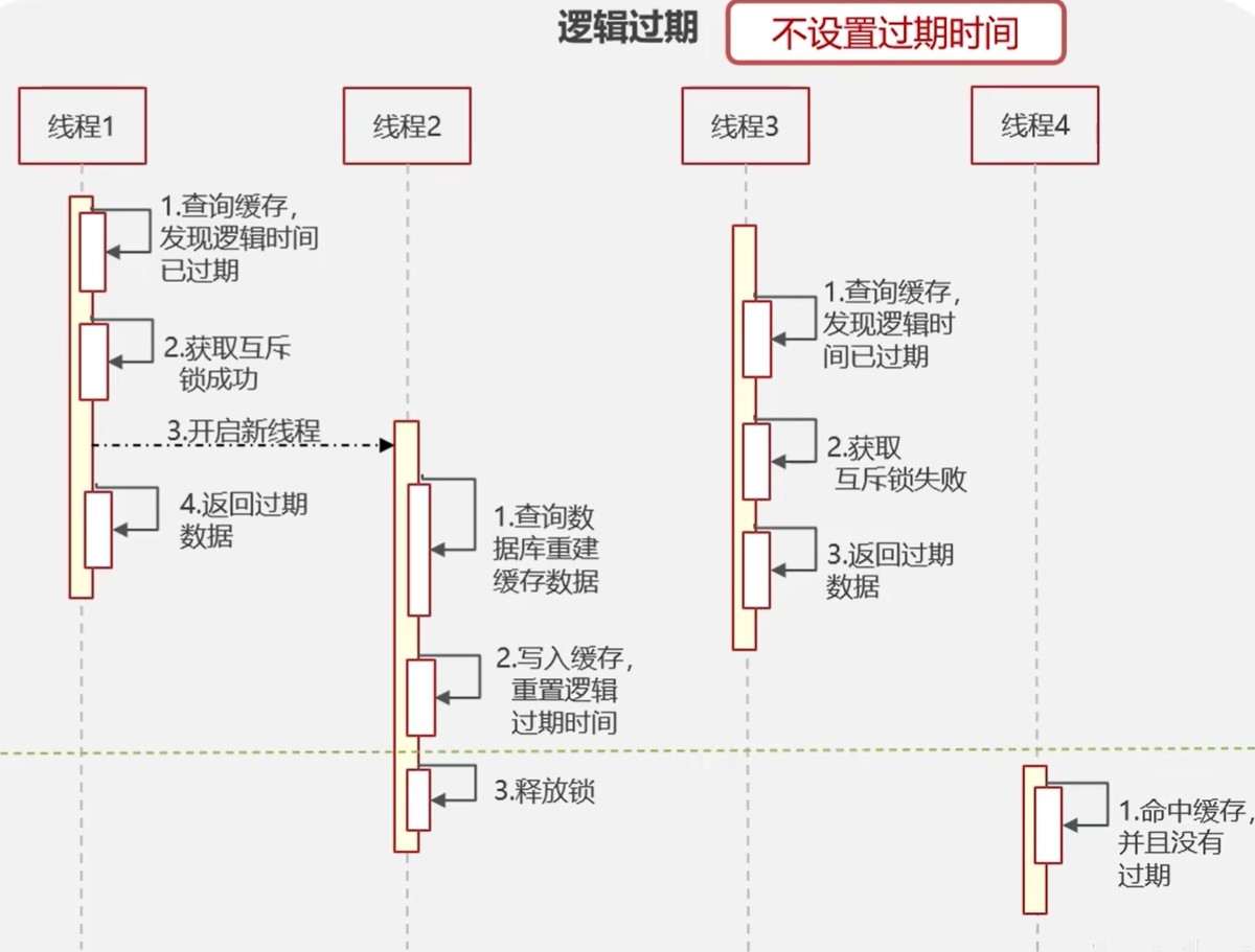 - 已过期:获取互斥锁, 此时开启一个新的线程去查询数据库重建缓存,并且将其逻辑时间设置为 当前时间+xxx分钟,释放锁的任务交给该新线程,开启新的线程后,直接返回过期的数据。在重建缓存过程中,其他线程进来查询缓存判断逻辑时间已经过期,且获取锁失败,直接给它返回刚刚缓存中查询出来的过期数据即可。