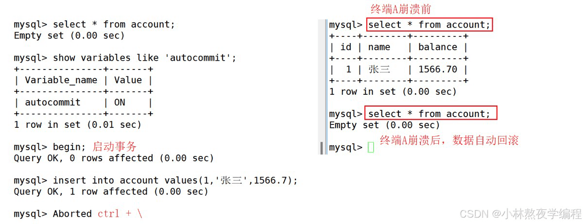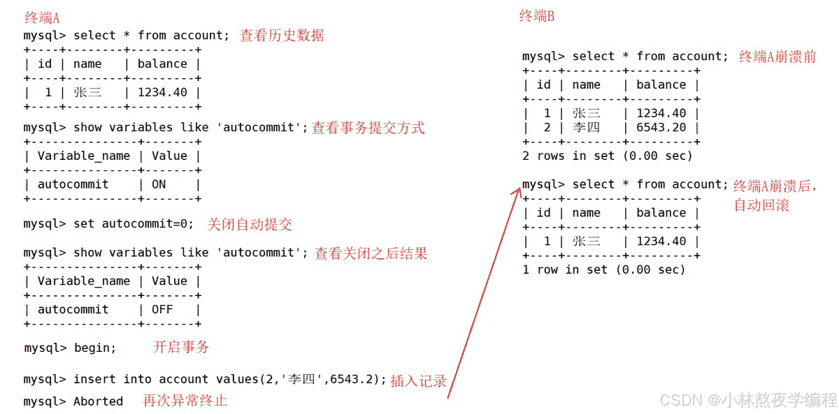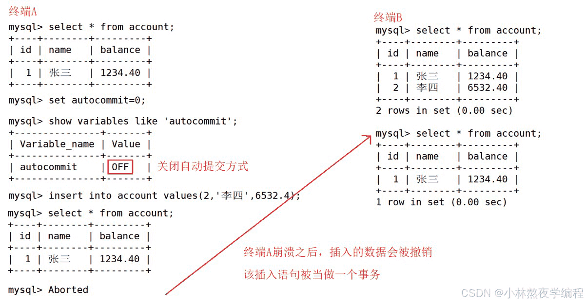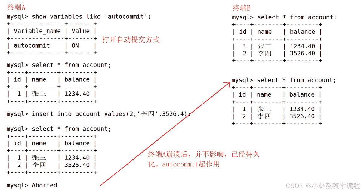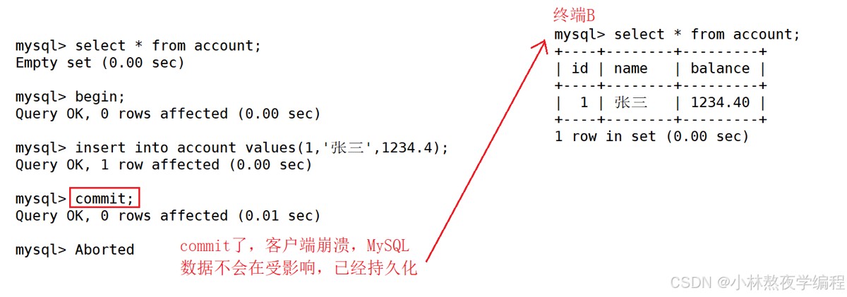 show variables like 'autocommit'; -- 依旧自动提交 +---------------+-------+ | Variable_name | Value | +---------------+-------+ | autocommit | ON | +---------------+-------+ 1 row in set (0.00 sec) select * from account; -- 当前表内无数据 Empty set (0.00 sec) begin; -- 开启事务 insert into account values (1, '张三', 1234.4); -- 插入记录 commit; --提交事务 Aborted -- ctrl + \ 异常终止MySQL --终端 B select * from account; --数据存在了,所以commit的作用是将数据持久化到MySQL中