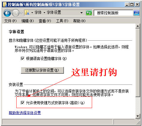 在字体设置窗口中,在“允许使用快捷方式安装字体(高级)(A)”的小方框里打钩,然后点确定按钮保存设置。