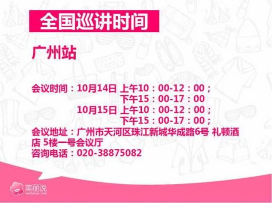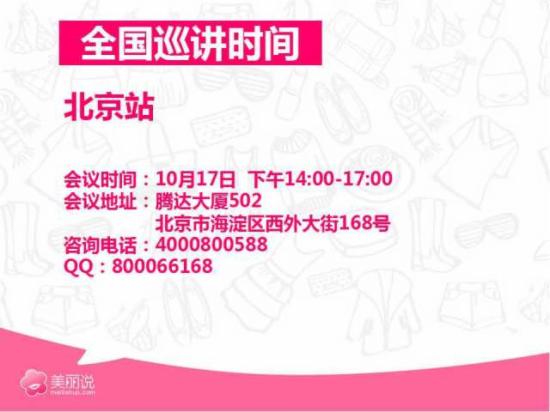 五、5大城市政策宣讲,北京、广州、杭州、武汉、成都五大城市线下宣讲,为地区商家全面解读美丽说双十一激励政策,力保商家出色应对。