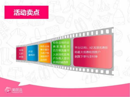一、1个主题5个专场力推特色商家,本次美丽说双十一大促以“女生专属版败家嘉年华”为主题,并细分为“衣服馆、美鞋馆、箱包馆、日化美妆馆、女生特别馆”五大特色会场,主打女生时尚牌。