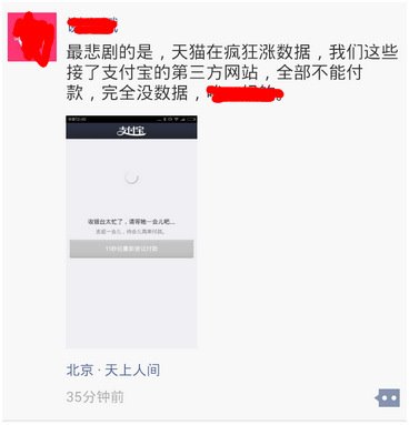 前方特派员透露,今年双11在手机支付宝上也一度出现瘫痪,即使在阿里巴巴的直播大厅中,也无法支付成功。