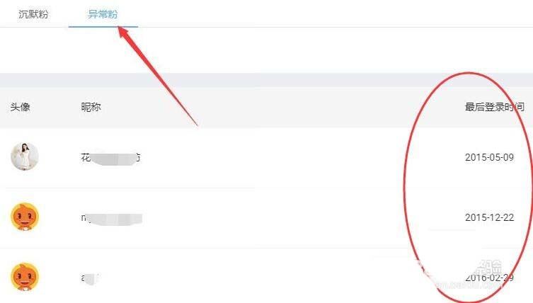 点击异常粉,可以查看异常的粉丝,右侧可查看该粉丝的最后登录时间。