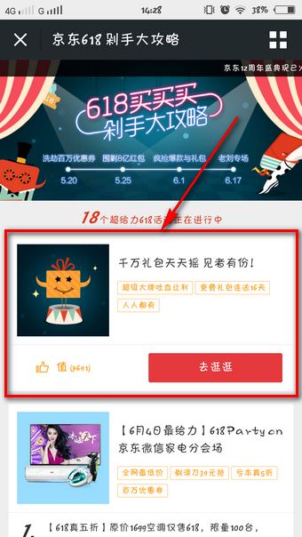 4、在京东618剁手大攻略界面,选择第一个选项“千万礼包天天摇,见者有份!”