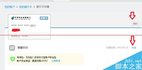 3、点金银行卡后,如图,可以选择删除该卡或者点击关闭,就可以取消该银行卡的快捷支付了。