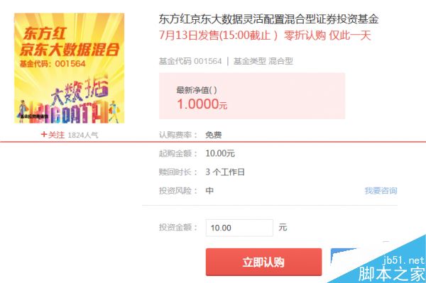 京东亲自带你炒股,京东大数据基金正式上线,仅限今日一天在京东理财频道开卖,免认购费,根据购买页面介绍,该基金起购10元,认购份额上限2亿,认购费1.2%(13日当天费率0折),两年后无赎回费