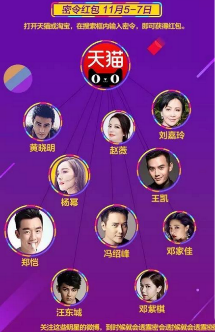 注意了,考验你是不是明星和媒体“铁粉”的时候也将到了,11月5日开始,赵薇 、刘嘉玲、 黄晓明、 杨幂、 王凯 、冯绍峰、 邓紫棋、 郑恺 、邓家佳 、汪东城等十位明星将通过微博发出密令,消费者可随时关注明星微博抢红包。此外,中新社、中央人民广播电台在内的13家媒体也会通过报纸、网站、广播、微博、微信等多个渠道发布密令,让消费者们边看边听新闻边抢红包。据悉,明星和媒体总共发布的红包数额将高达1260万。