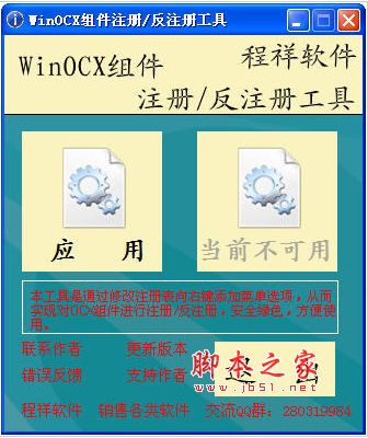 一、如果在运行某软件或编译程序时提示缺少、找不到组件注册反注册工具 v1.1 中文绿色免费版等类似提示,您可将从脚本之家下载来的组件注册反注册工具 v1.1 中文绿色免费版拷贝到指定目录即可(一般是system系统目录或放到软件同级目录里面),或者重新添加文件引用。