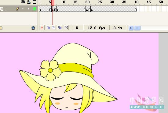 在第6帧右击插入关键帧,或是直接点下第6帧,按F6插入关键帧,在这一帧中,把原来的眼睛删掉(因为前现我们把它的眼睛组合了,所以删掉也不会影响下面的脸,这就是为什么要分开组合的原因啦),用椭圆工具画出如图的弯眼,一样,画一只,另一只复制,放到适当的位置就可以了。