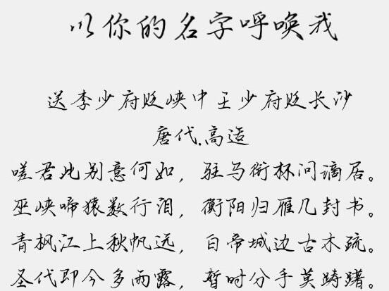 以你的名字呼唤我是一款十分好用,且非常漂亮的中文字体,同时也是由文道字库倾情发布的作品,字体笔触粗细适中,字型略带潦草,却又无比的清晰,给人一种悬崖峭壁的视觉感,适应于报纸和杂志和书籍中常用字体海报、个性促进品牌标志设计、文本装潢、信息展示、篆刻制模英文、数据制作、装潢设计、视觉设计、字帖等一切合法应用场景,有喜欢的朋友可免费下载收藏。