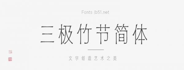 三极竹节简体,该作品整体风格纤细而有力量,字体轻巧简洁,笔画粗细匀称,连接处为竹节状,特点独特。起笔收笔为平直有力,折、钩转折明显如竹之嫩条。它的灵感来源于竹枝形状,字体纤细挺拔,耐人寻味。古人以“宁可食无肉,不可居无竹”,竹有坚韧和节操的象征。视觉效果简洁挺拔实用性强。本作品适用于印刷媒介的标题与正文排版、各类屏幕显示及影视字幕、游戏等。