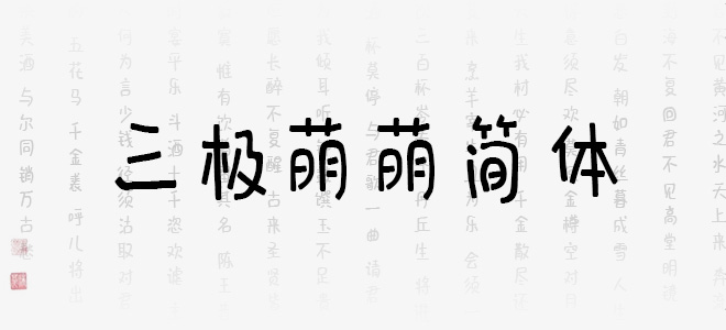 三极萌萌简体以儿童写字的特点,勾勒笔画,具有童稚之情。笔画圆润,字形轮廓统一,灵动可爱,溢于画笔,清新萌动。适用少儿类读物、书刊以及社交网络个性化用字。