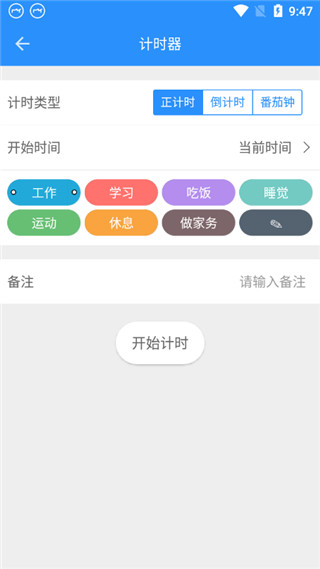 4、在计时功能中我们可以添加某个时间在做什么事情,如工作、学习、吃饭等状态,都可以详细的记录,一次来了解自己的健康状态。