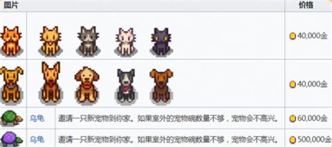在初始宠物达到最大好感度,或在第二年还没有宠物的情况下玩家可以购买宠物饲养证以领养新的宠物;领养新的宠物需要提前建造宠物碗(找罗宾建),不想继续养的宠物可以对其使用蝴蝶粉进行移除(找科罗布斯花2w金购买)。