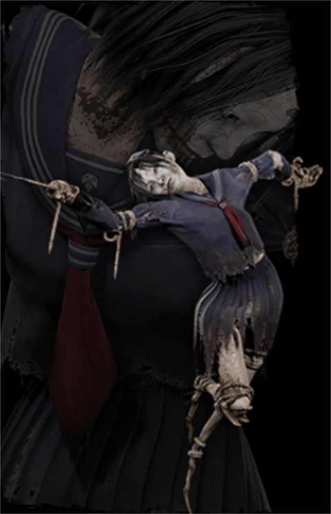 被肢解后重组成木偶的形象,原型极有可能是都市传说「假面死人」或「鹿岛零子」,这种形象的出现,往往与极端的暴力,特别是性暴力相关。